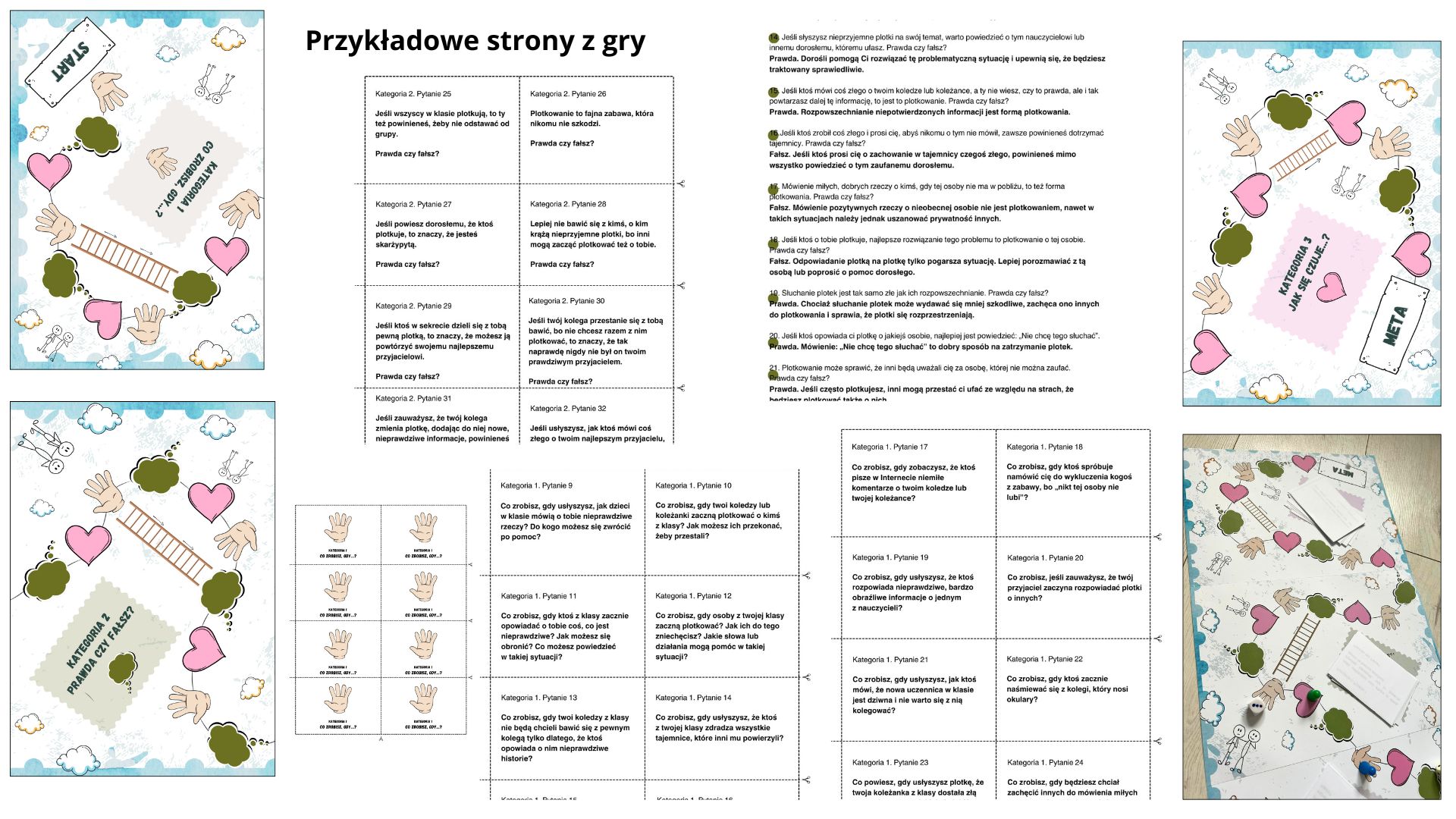 Gra planszowa „Plotkowanie i obgadywanie” pomaga dzieciom w wieku 7–9 lat zrozumieć, kiedy rozmowa zaczyna przeradzać się w plotkę i jak można na to zareagować. Składa się z planszy oraz 105 kart podzielonych na trzy kategorie: pytania otwarte typu „Co zrobisz, gdy…”, stwierdzenia do oceny „Prawda czy fałsz?” oraz pytania o emocje osób, o których się mówi. Dziecko losuje kartę, czyta pytanie lub słucha prowadzącego i zastanawia się, jak się zachować albo co może czuć druga osoba w danej sytuacji. Pytania odnoszą się do zdarzeń znanych dzieciom z życia szkolnego i rówieśniczego. Gra rozwija umiejętności takie jak rozróżnianie faktu od opinii, zauważanie emocji, reagowanie na obgadywanie, podejmowanie decyzji i stawianie granic. Dzięki prostym zasadom i pytaniom bliskim codziennym doświadczeniom dzieci sprawdza się już przy pierwszym użyciu.