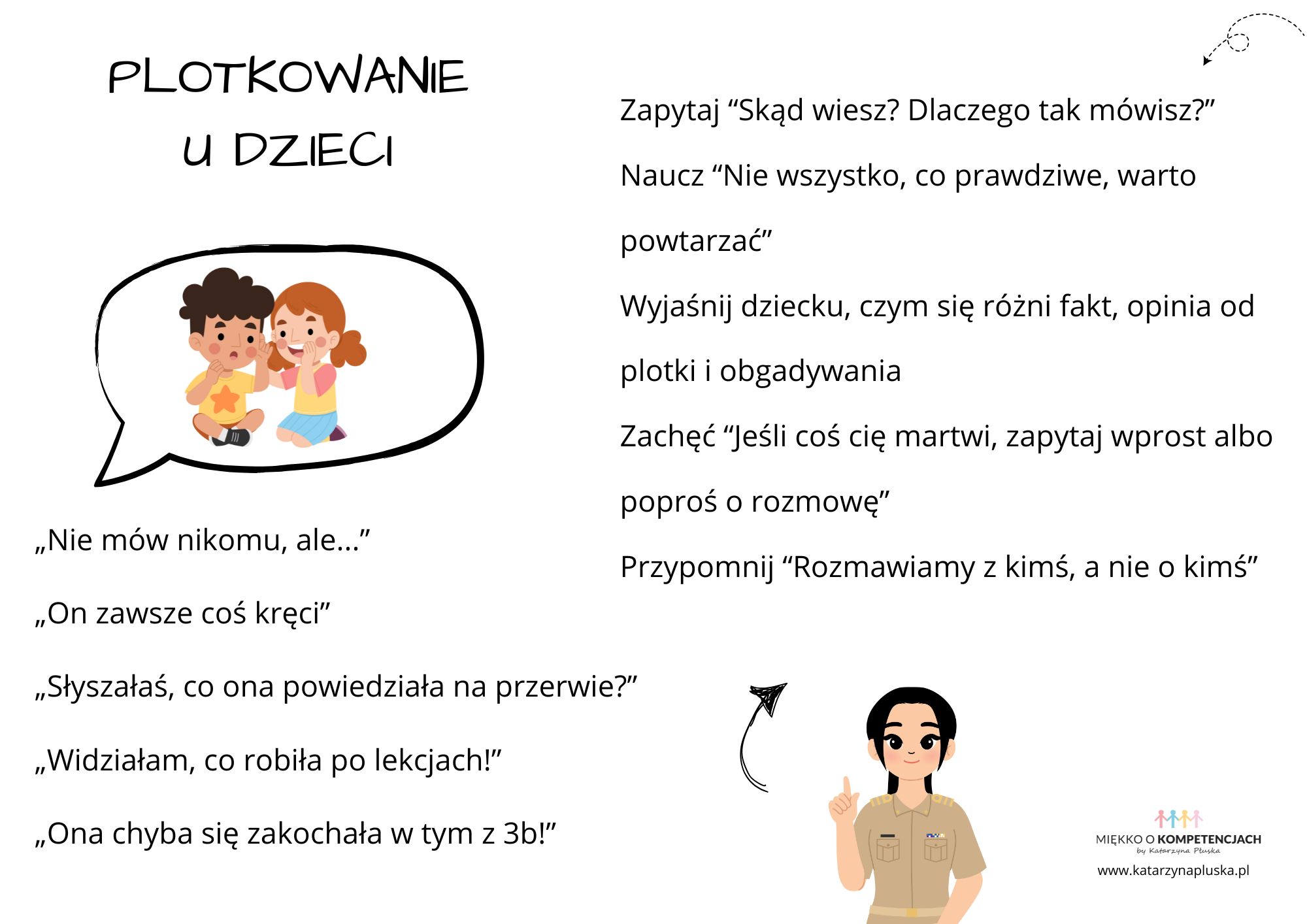 Rozmowa o tym, co wypada powiedzieć, a co nie, nie musi być trudna. Wystarczy, że będzie oparta na szacunku i ciekawości. I to nie jest temat na jedną rozmowę. Do plotkowania u dzieci warto wracać przy okazji drobnych sytuacji, przykładowo po lekcji, po przerwie i punktowo przy konflikcie. Im częściej dziecko ma szansę przemyśleć coś na spokojnie, tym większe prawdopodobieństwo, że następnym razem zatrzyma się, zanim coś powie.