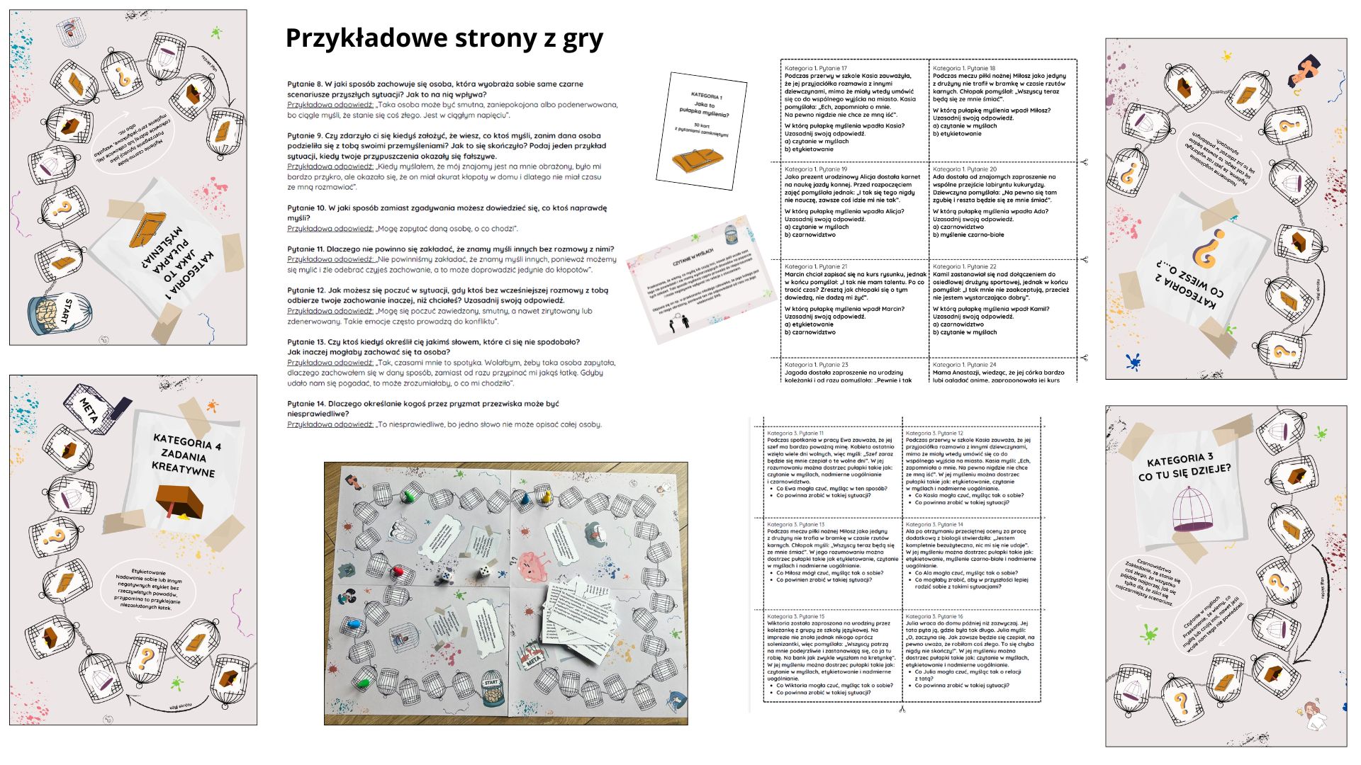 Gra zawiera szczegółową instrukcję „ściągę”, która krok po kroku wyjaśnia, jak przygotować się do zajęć, poprowadzić rozgrywkę i na co zwracać uwagę podczas pracy z młodzieżą. W materiałach znajduje się omówienie każdej z pułapek myślenia, a także wersja planszy z krótkimi opisami przy polach, która ułatwia prowadzenie gry. Dodatkowym wsparciem są odpowiedzi dla prowadzącego, dołączone do kart zamkniętych i otwartych. Dzięki nim osoba prowadząca nie musi mieć specjalistycznego przygotowania psychologicznego, aby skutecznie pracować z grą i rozmawiać z uczestnikami o tym, co pojawia się podczas rozgrywki.