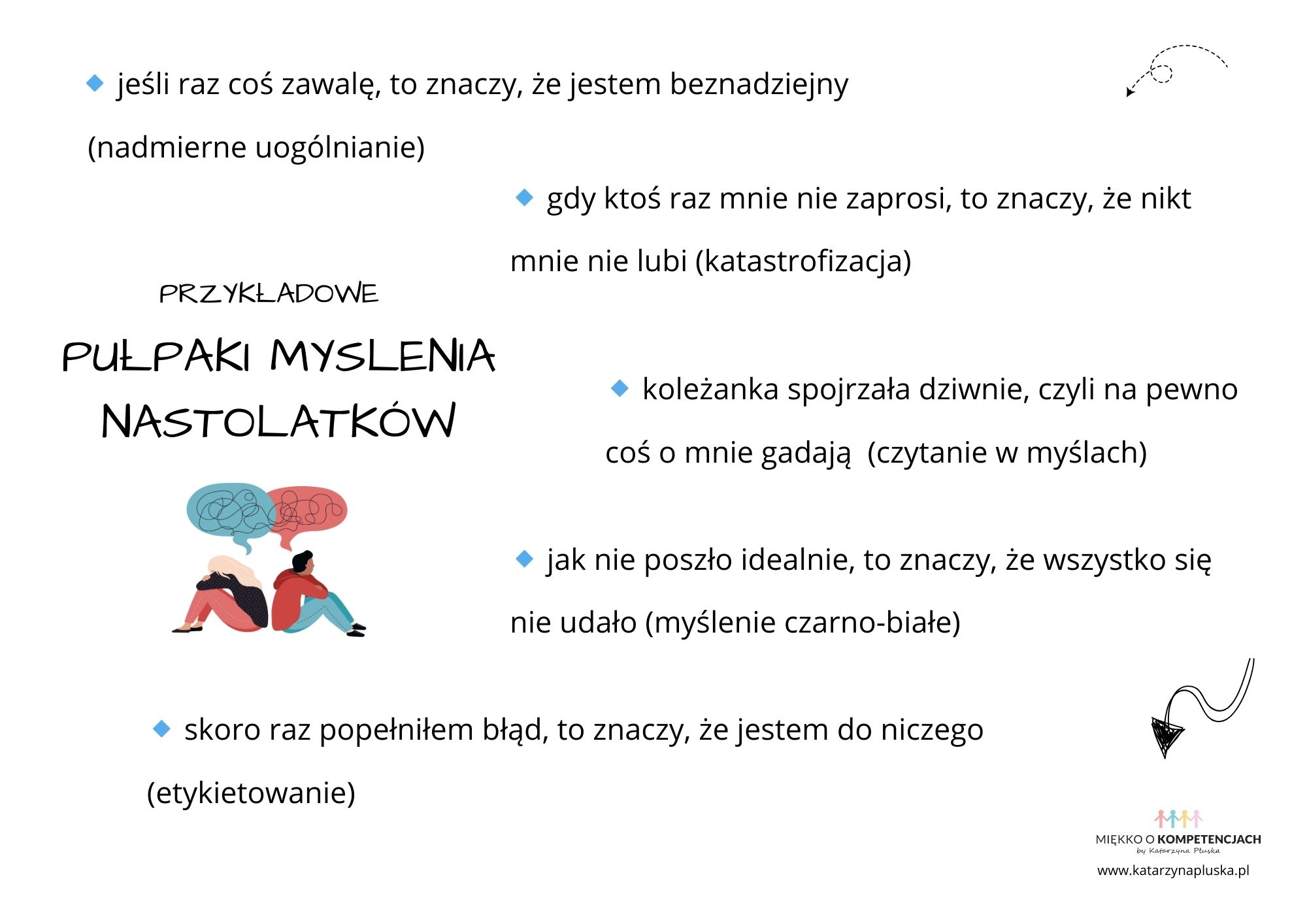 Zakładanie najgorszego możliwego scenariusza jeszcze zanim coś się wydarzy, czyli gdy zwykła pomyłka staje się początkiem czarnego scenariusza. Jeśli dziś mnie nie zaprosili, to znaczy, że mnie nie lubią. Jeśli dostałam czwórkę zamiast piątki, to pewnie wypadnę z grupy najlepszych uczniów. Nastolatki często przewidują najgorsze, zanim jeszcze wydarzy się cokolwiek konkretnego.