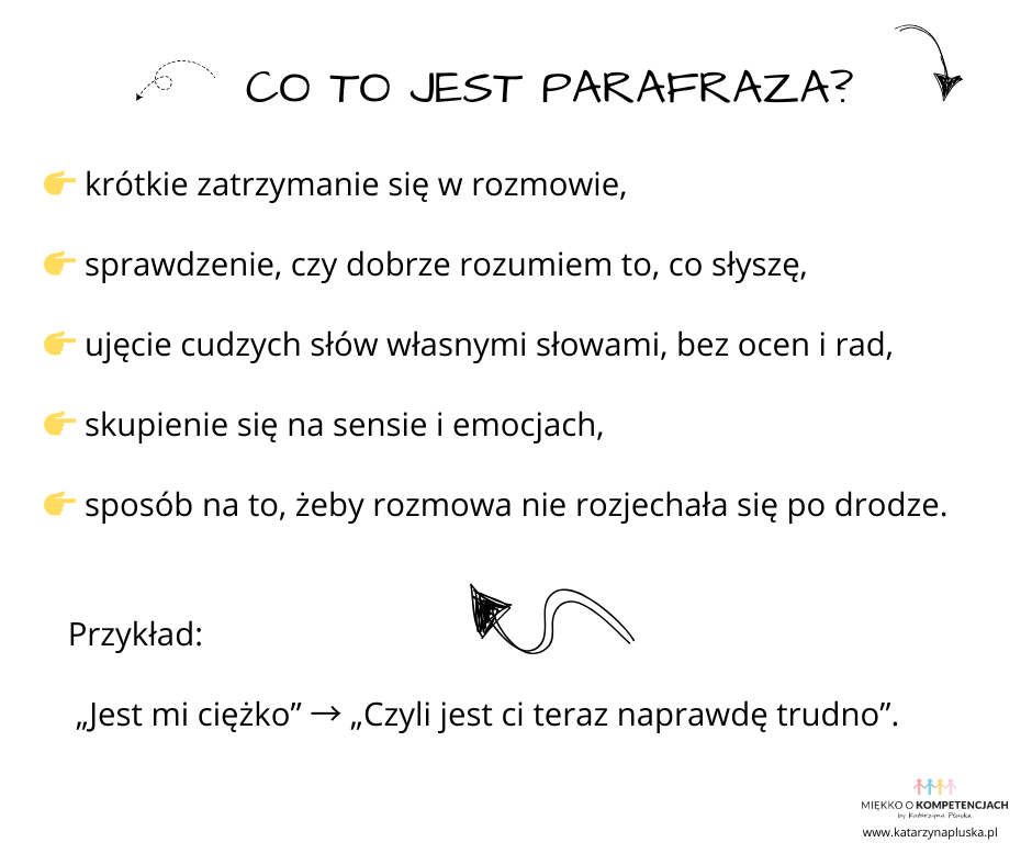 Rozmowy często nie psują się dlatego, że ludzie nie chcą się słuchać, ale dlatego, że za szybko reagują. Parafraza jest jedną z najprostszych umiejętności komunikacyjnych, która pomaga naprawdę zrozumieć drugą osobę i uporządkować rozmowę. Zwłaszcza w sytuacjach trudnych lub emocjonalnych. W tym artykule pokazuję, na czym polega parafraza w praktyce oraz udostępniam darmowy zestaw ćwiczeń do samodzielnej pracy.