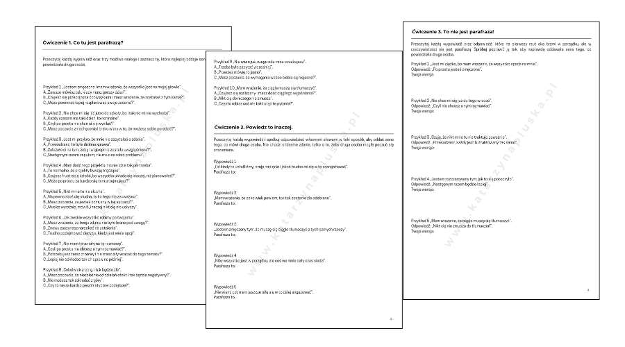 Dobrym wsparciem w uczeniu się parafrazy są krótkie ćwiczenia, które pozwalają zobaczyć różnicę między reagowaniem a słuchaniem. Praca na przykładach, zamienianie ocen na sprawdzanie sensu oraz przyglądanie się własnym automatycznym odpowiedziom pomaga budować większą uważność w rozmowie. Właśnie dlatego przygotowałam zestaw prostych ćwiczeń, które można wykorzystywać zarówno w pracy z dorosłymi, jak i z młodzieżą oraz dziećmi. W domu, w szkole i podczas zajęć rozwojowych.